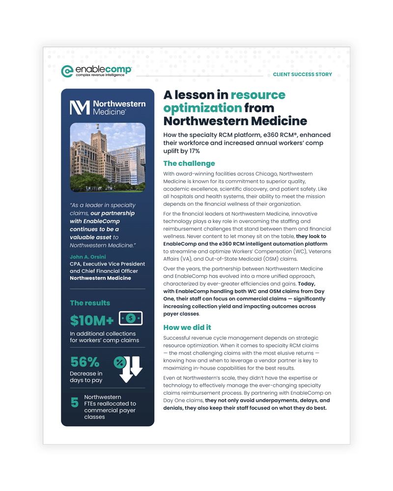 Discover how EnableComp’s specialty revenue cycle platform, e360 RCM®, enhanced Northwestern Medicine’s workforce and increased annual workers’ comp uplift by 17%.