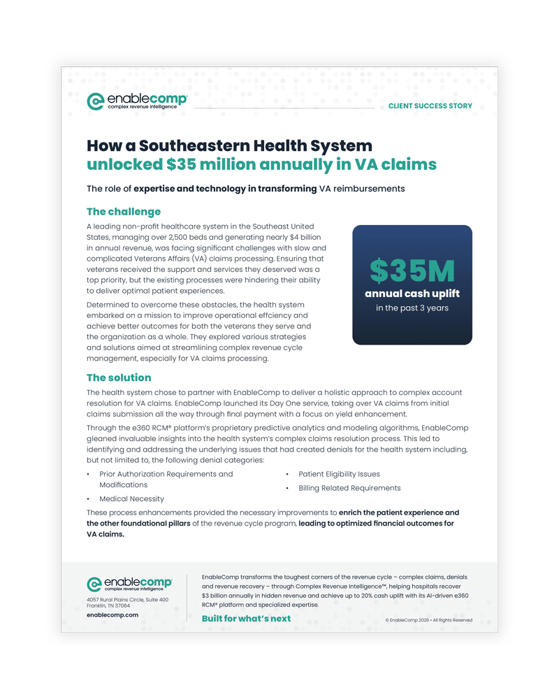 The health system chose to partner with EnableComp to deliver a holistic approach to complex account resolution for VA claims. EnableComp launched its Day One service, taking over VA claims from initial claims submission all the way through final payment with a focus on yield enhancement.