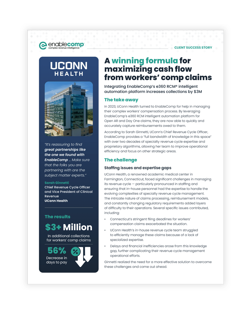 In 2023, UConn Health turned to EnableComp for help in managing their complex workers’ compensation process. By leveraging EnableComp’s e360 RCM intelligent automation platform for Open AR and Day One claims, they are able to quickly and accurately capture reimbursements owed to them.