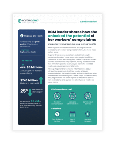 Since working with EnableComp, Regional One has seen a lifetime cash uplift of $243 Million, a 25% decrease in days to pay, and a $5 Million annual uplift for workers’ comp claims. With decades of intelligent automation and expertise, EnableComp is the industry leader in specialty revenue cycle management solutions. Reach out to us today to learn more about what we can do for your organization.